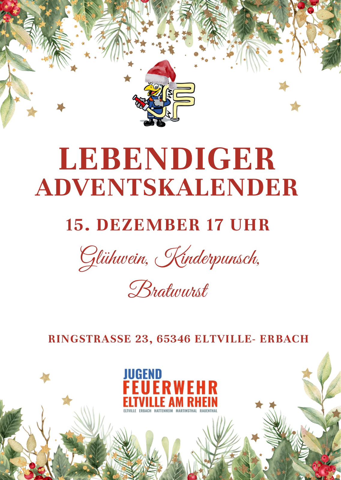 Kalender Wann: 15. Dezember 2025 um 17:00 2025-12-15T17:00:00+01:00 2025-12-15T17:15:00+01:00 Wo: Feuerwehrhaus Ringstrasse 23 65346 Eltville-Erbach Veranstaltungen Die Freiwillige Feuerwehr Erbach lädt vom 06. bis 07.09.2025 zum Tag der Feuerwehr ein. Die Veranstaltung findet im Feuerwehrhaus Weiterlesen